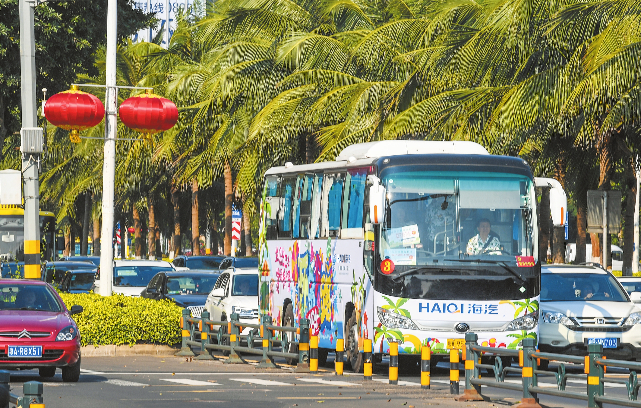为满足不同游客的需求,观光巴士提供多种班次,游客可以根据自己的行程进行选择。值得一提的是,观光巴士不仅有多巴胺配色,搭配充满海南元素的装饰画,还有人性化的设计,车内设施齐全,座椅舒适宽敞,配有导游全程服务,备有饮品和特色小吃等,让游客在旅途中能够舒适地欣赏海南美景。