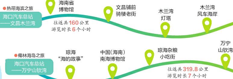 正式开通的1.0版本环岛旅游公路观光巴士共有两条游览线路,为海口汽车总站——文昌木兰湾(往返线路)和海口汽车总站——万宁山钦湾(往返线路)。
