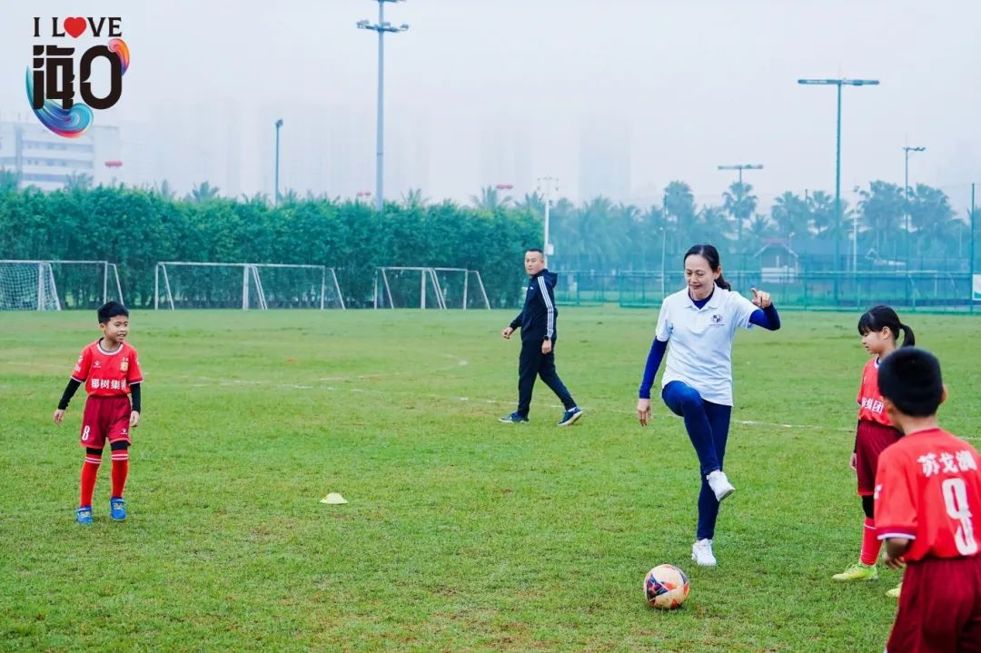 活动的最后,韦海英女士在海口市世纪公园足球场进行了户外足球指导示范,现场指导小球迷们进行了一些足球技巧和团队配合演练。