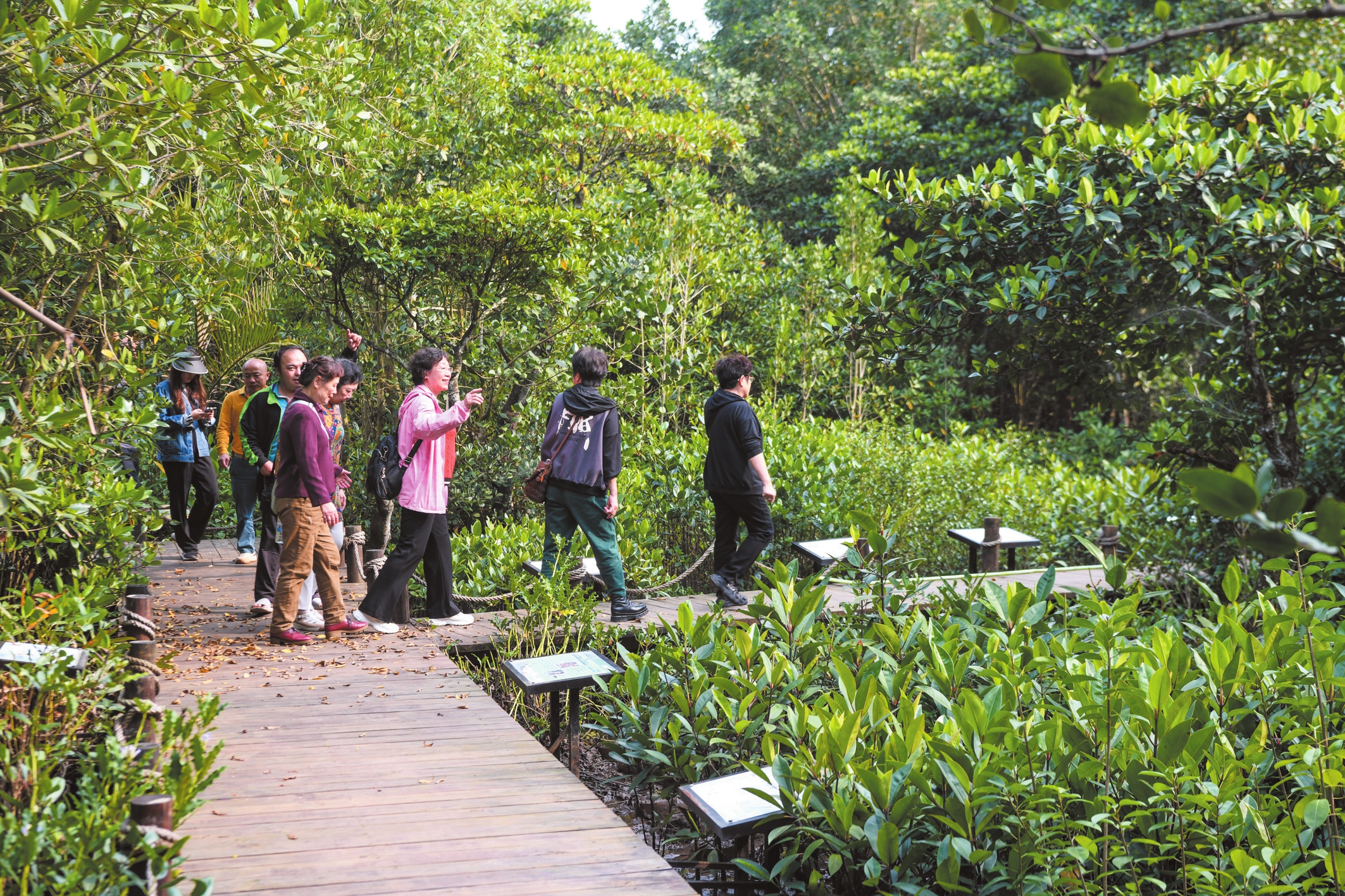3月13日,市民游客在位于演丰镇山尾村的红树林科普栈道参观游玩。本报记者 杨鹤摄