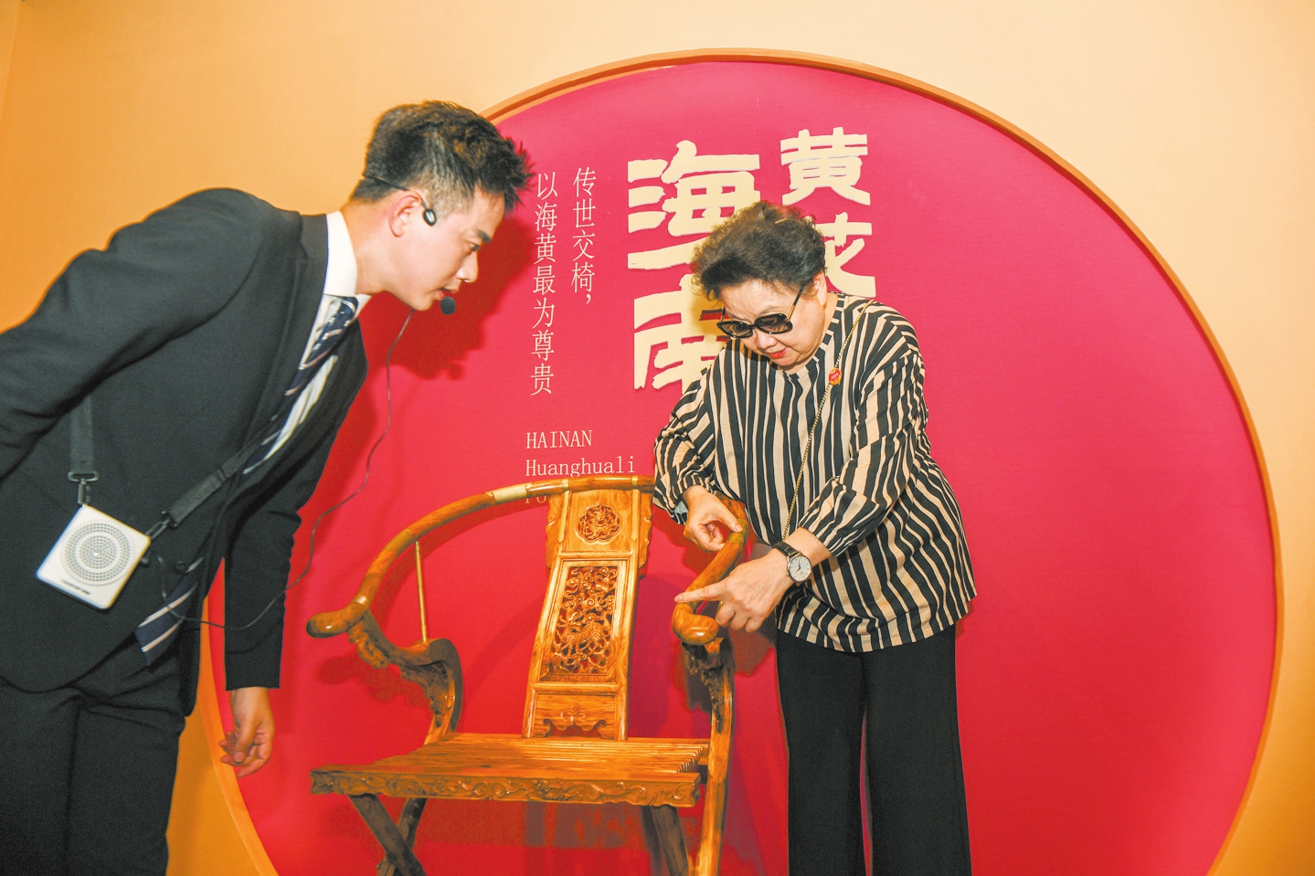 3月27日,在东屿岛文化公园海口城市展“和雅”板块,参展嘉宾在海南黄花梨展厅鉴赏黄花梨座椅。本报特派记者 康登淋 摄