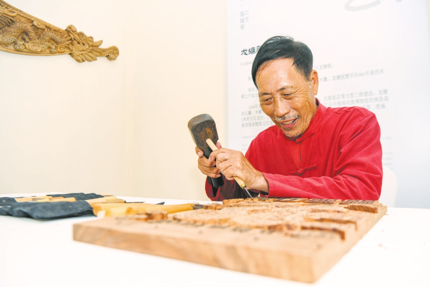 3月27日,在东屿岛文化公园海口城市展龙塘雕刻展区,非遗传承人王科美伏在工作台上,借助工具细心雕琢一件名为“龙行龘龘”的作品,吸引不少观展者在一旁观摩。“好漂亮的作品!”有人惊呼道。记者注意到,在王科美的工作台上,20余种刀头大小不一、长短不齐的雕刻工具整齐排开,“像这种细节处,就需要用到小号刀头的工具,对捶打的力度要求也更高。”王科美介绍。