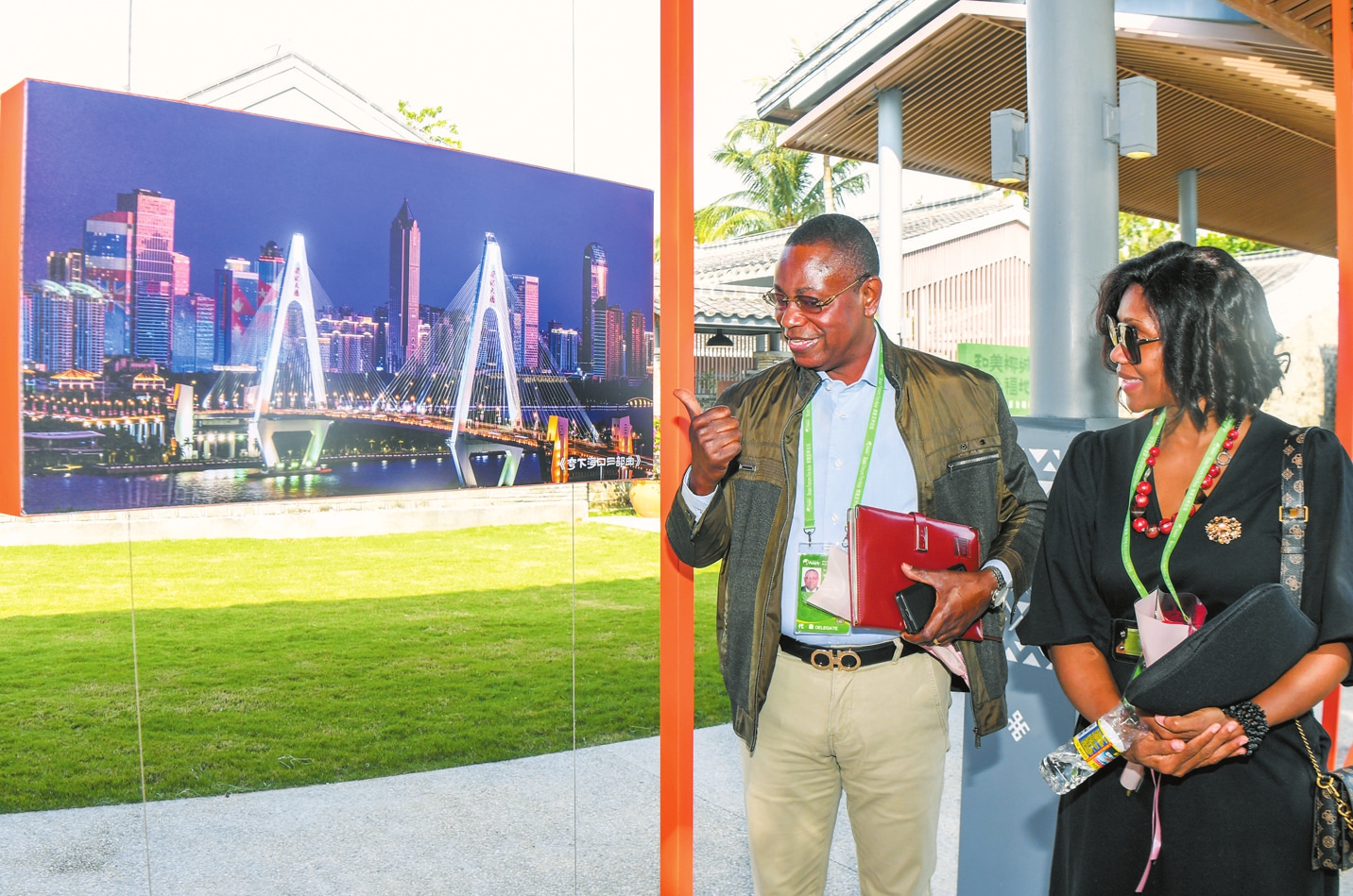3月27日,在东屿岛文化公园海口城市展,外籍嘉宾通过参观优秀摄影作品走近海口、了解海口,并竖起大拇指点赞。本报特派记者 康登淋 摄