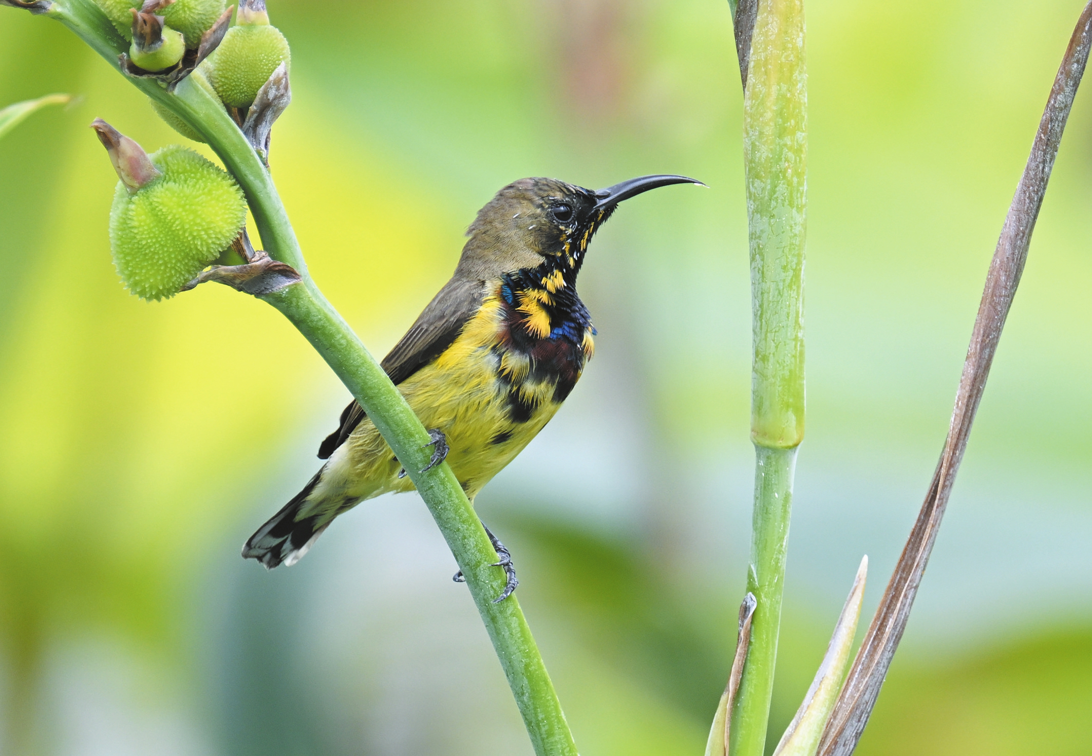 一只黄腹花蜜鸟在金牛岭公园内盛开的美人蕉花丛中觅食。