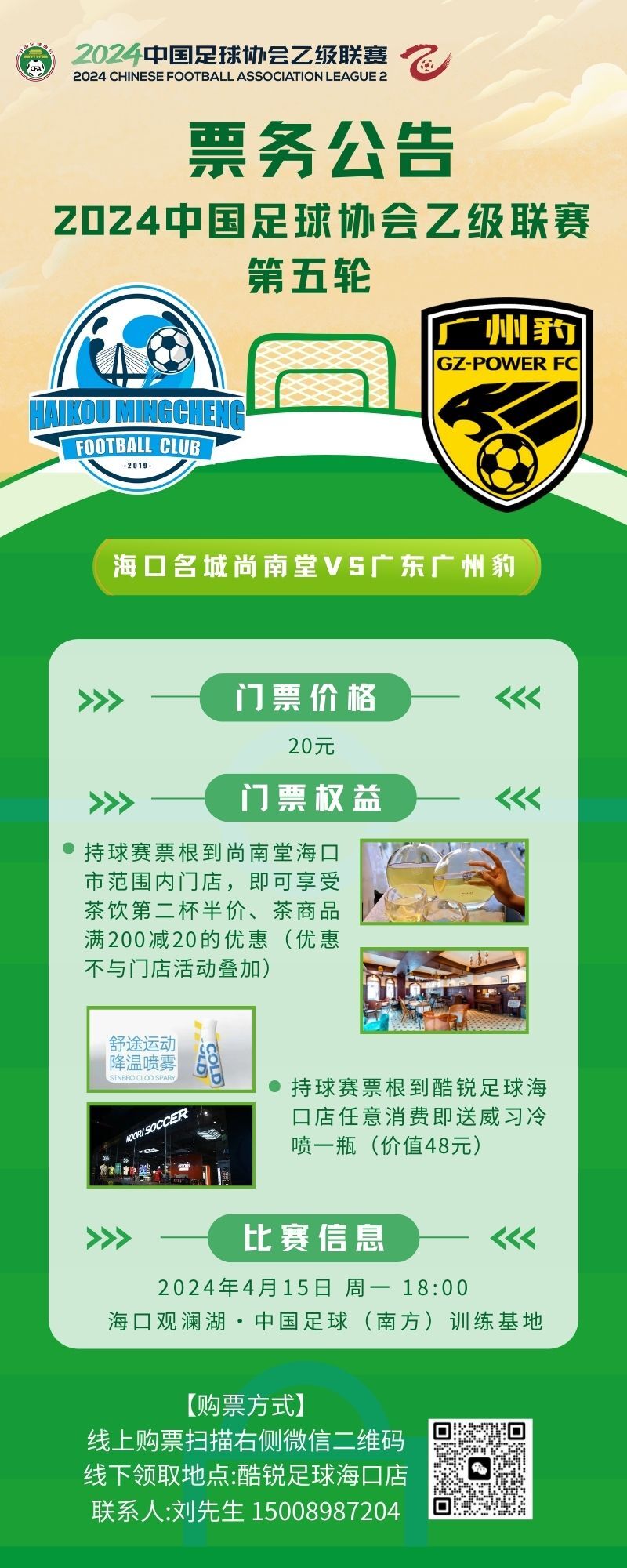 原标题;票务 | 2024中乙联赛05轮 海口名城尚南堂VS广东广州豹门票售卖公告