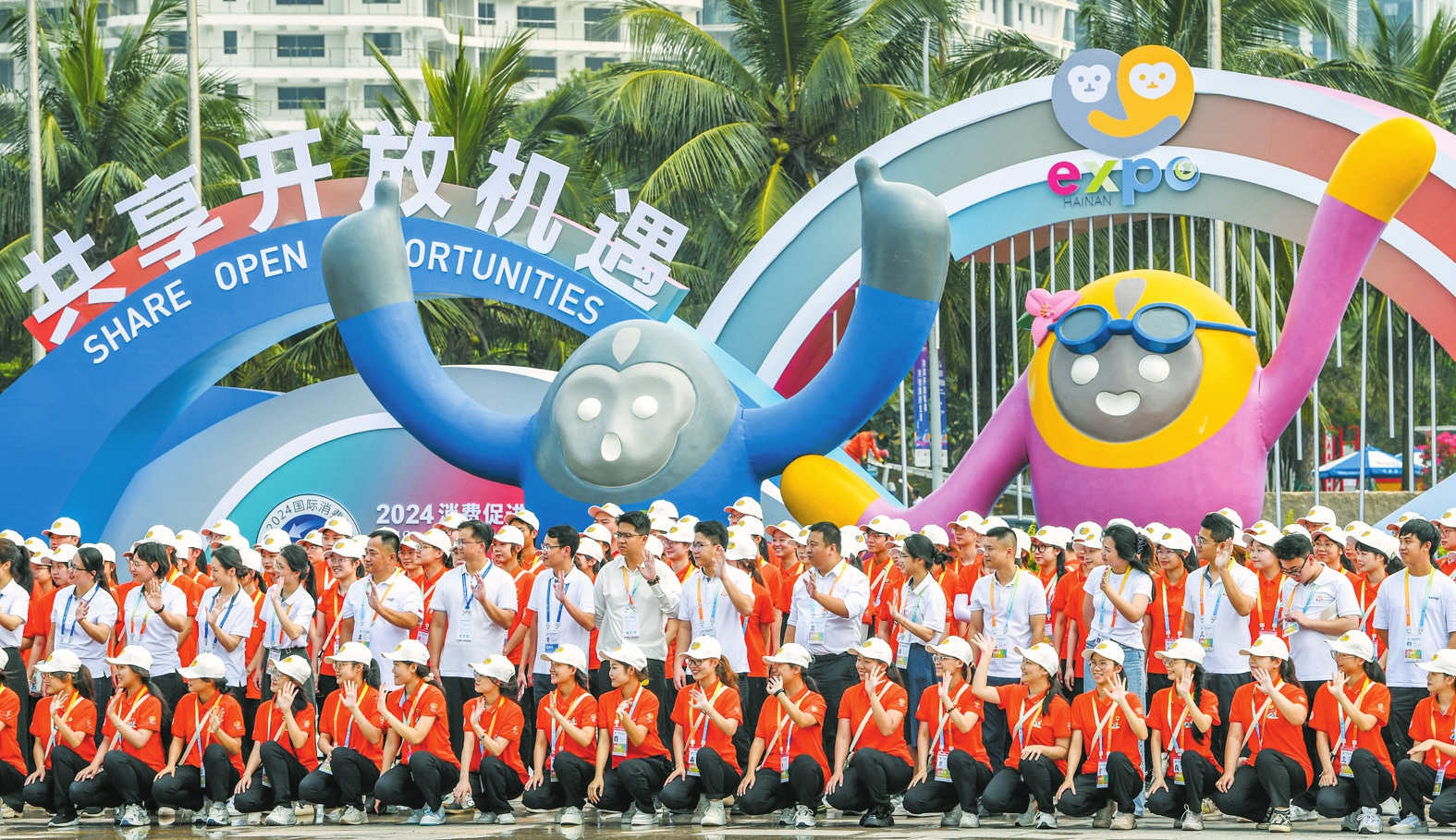 在海南国际会展中心外,工作人员与第四届消博会吉祥物合影留念。本报记者 康登淋 摄