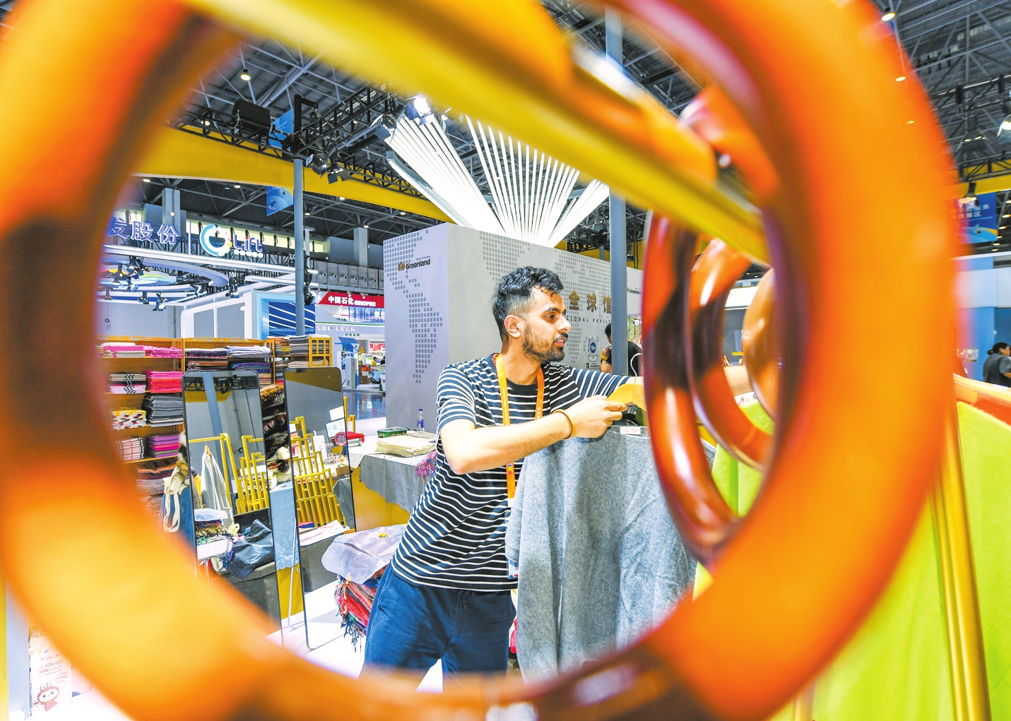 工作人员在设计展台造型。本报记者 康登淋 摄