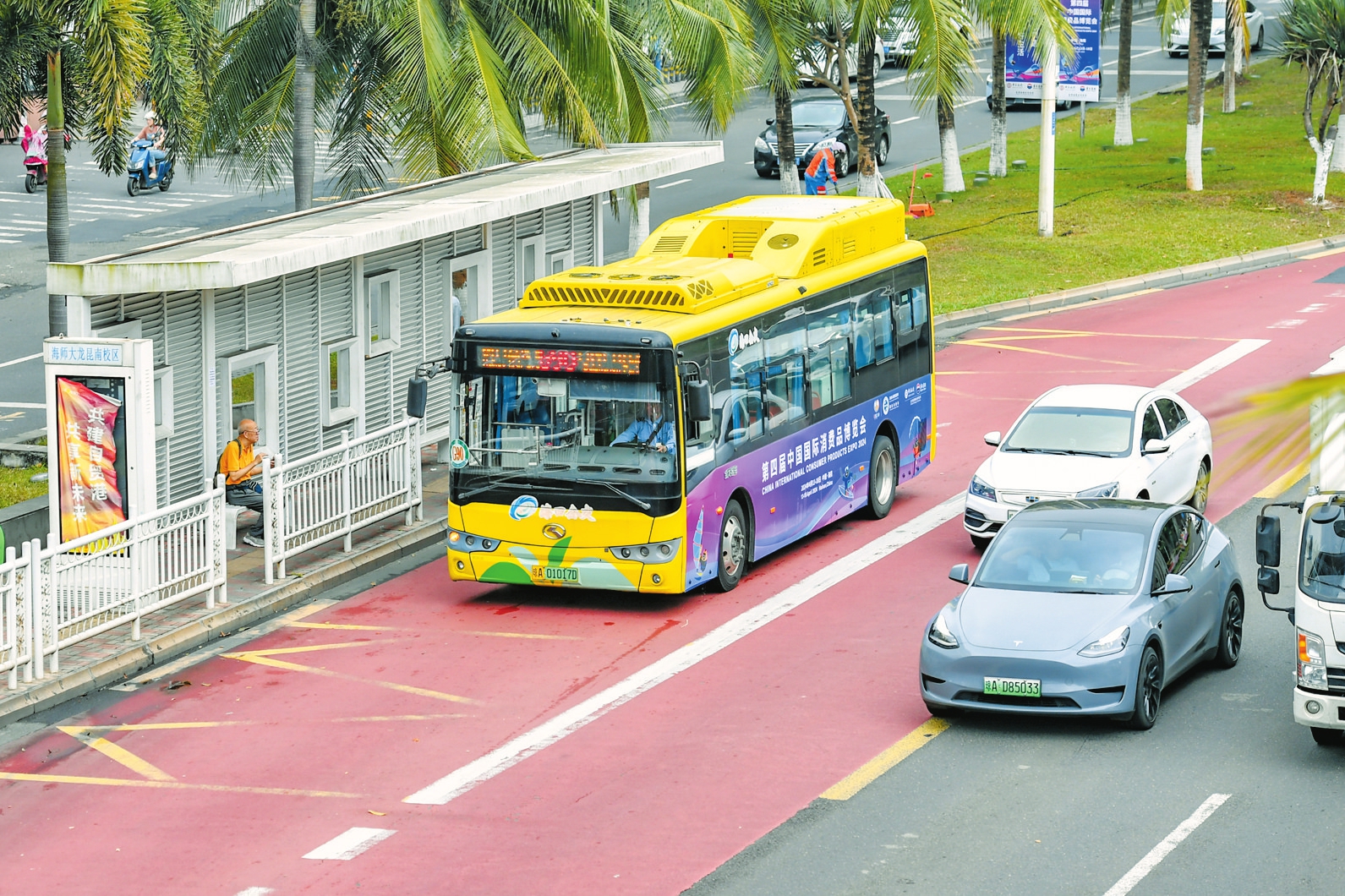 滨海大道上,椰树和鲜花相映成趣,川流不息的车流之中,绘有消博会宣传海报的公交车成为一道移动的风景线。消博会期间,海口将开通12条公交专线,调配177辆公交车,线路主要覆盖港口、高铁站、长途汽车站等对外交通枢纽,以及市内部分大型酒店、商超、免税城等重要商业中心,为市民和客商提供“一站直达”消博会会场的公交出行服务。