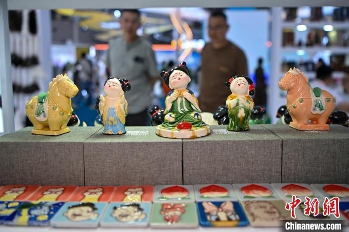 在河南馆,憨态可掬的“墩墩马”、可作手机支架的唐三彩侍女俑、活灵活现的釉彩生肖等唐三彩工艺品,占据展馆C位。
