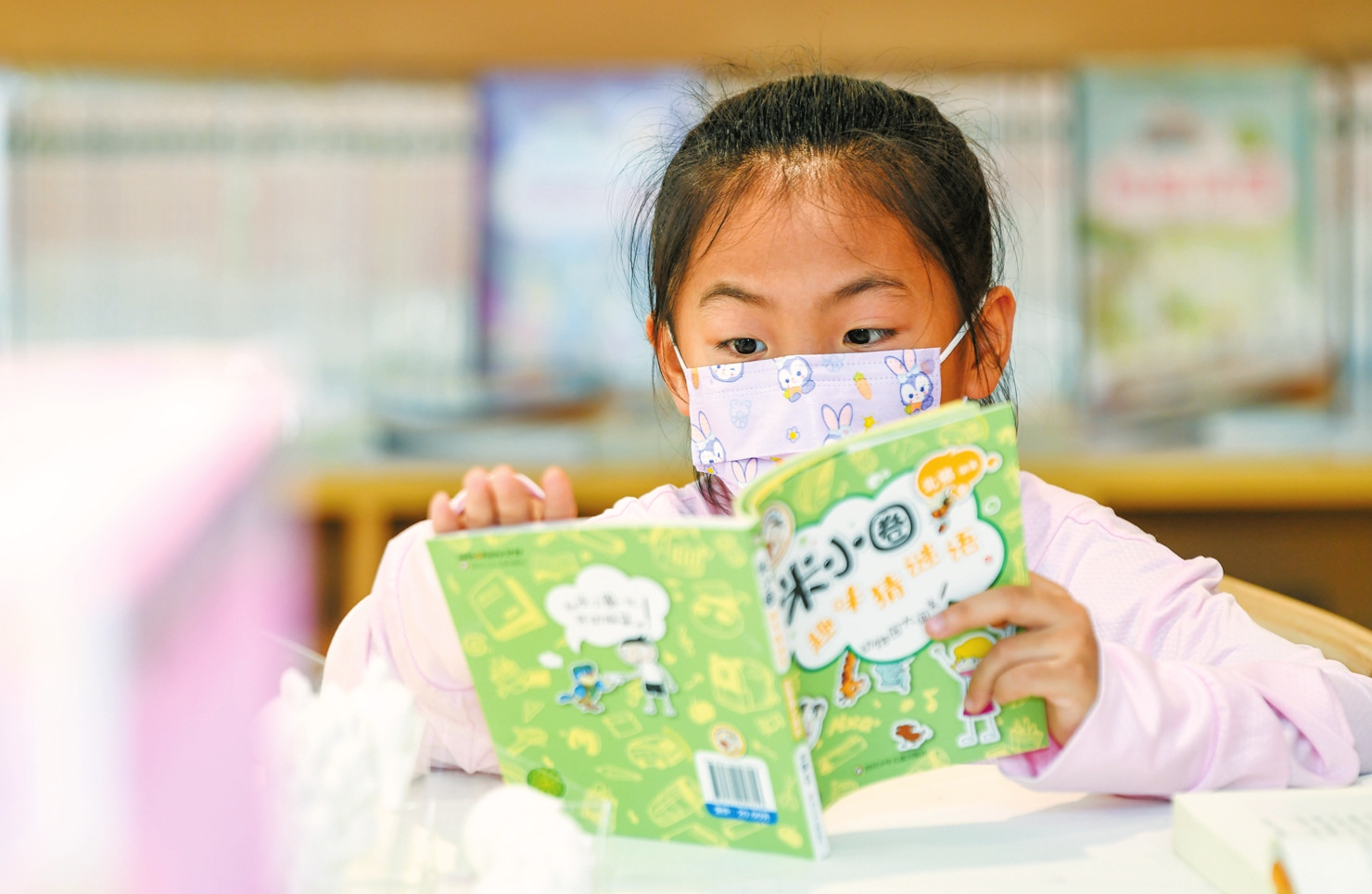 4月22日,美兰区海甸街道新安社区社区书屋内,58岁的居民杨浩鹏津津有味地阅读养生书籍,6岁的孙子在一旁翻阅彩色绘本。“这里的书籍每过一阵就更新,种类繁多,是周边居民阅读的好去处。”杨浩鹏说。