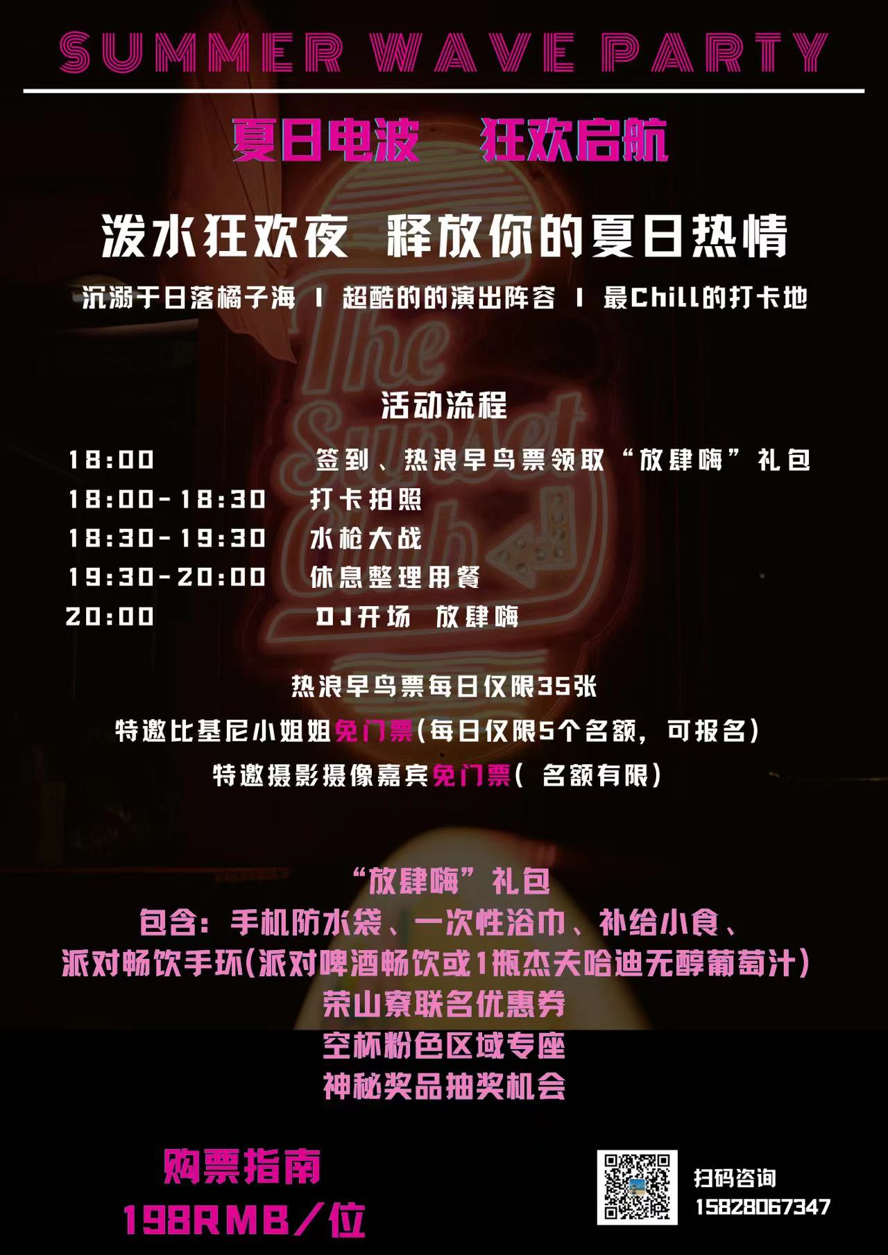 泼水狂欢夜!释放你的夏日热情,沉溺于日落橘子海,超酷的的演出阵容,最Chill的打卡地。热浪早鸟票每日仅限35张,特邀比基尼小姐姐免门票(每日仅限5个名额,可报名)。还有“放肆嗨”礼包等你来,包含:手机防水袋、一次性浴巾、补给小食、派对畅饮手环(派对啤酒畅饮或1瓶杰夫哈迪无醇葡萄汁)。最最主要的是,还可获得荣山寮联名优惠券空杯粉色区域专座神秘奖品抽奖机会!