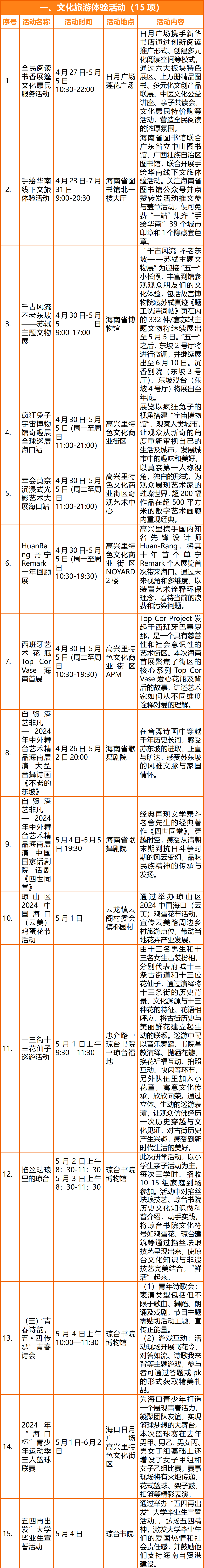 还有新开街的琼台书院和琼台福地历史文化街区,可参与换花巡游,感受琼山历史文化魅力。5月1日至5月4日,以“走进琼山历史,感受书院文化”为主题的五一·琼台书院文化坊活动将在府城街区、琼台书院博物馆举行,其中,十三街十三花仙子巡游活动将于5月1日上午9:30-11:30举行,以十三位花仙子通过立体、生动的巡游表演,让市民游客经历一次历史“穿越”与文化的见证。活动路线以忠介路为起点,途经琼台书院到达琼台福地;而5月2日至5月3日将在琼台书院博物馆举行掐丝珐琅里的琼台活动,“鲜活”的表现出台文化知识与非遗技艺的完美结合;为弘扬“五四”精神,展示当代大学生青年奋发进取的精神风貌,5月4日,“青春诗韵,五•四传承”青春诗会也将在琼台书院博物馆举行。