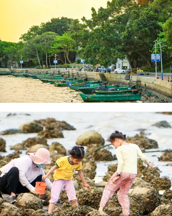 渔船在海浪的轻拍下摇晃舞动,远处仍在行驶的船只,则在两侧绘出一道道洁白美丽的浪花。此情此景,宁静又恬淡,让人身心轻快。喜欢赶海的朋友,也可以在这里体验收获的喜悦哦!