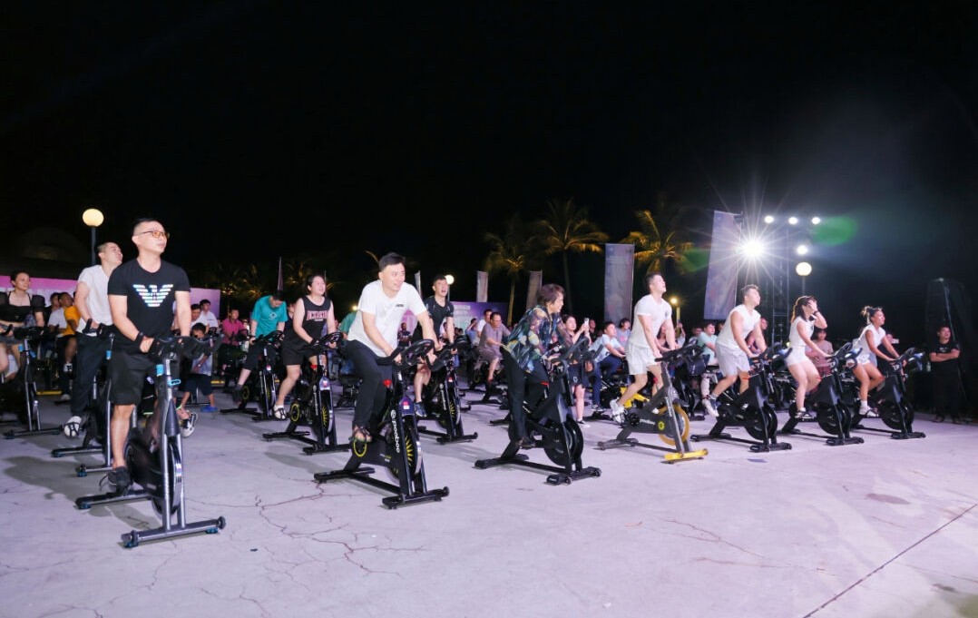 在各类器械中,整齐划一的动感单车最为引人注目。在动感的音乐中,聚光灯来回变换,参与者们在教练引导下爬坡、冲刺,活力四射。
