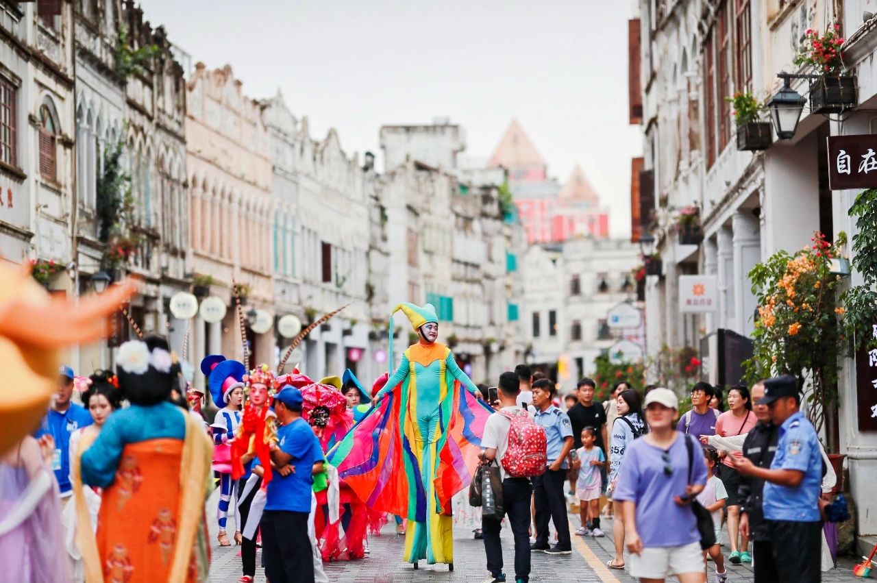 五一期间,“向海而歌•奇幻巡游季”体验活动在海口骑楼老街、世纪公园·云洞图书馆盛大举行,现场人山人海、锣鼓喧天,节庆欢乐氛围拉满。活动当天,一支由舞蹈方阵、非遗文化方阵、国潮汉服方阵、五公祠八公巡游方阵、火山方阵、年代旗袍方阵等组成的奇幻巡游队伍,沿着骑楼老街水巷口至中山路的古老街巷行进。在本次巡游中,海口非遗得到充分展示,八音乐器、信俗展示、公仔纷纷亮相。白天巡游,晚上在椰林广场举行泡泡奇幻T台,少儿时装走秀《多巴胺时尚夜》也成为五一假期期间的璀璨焦点。