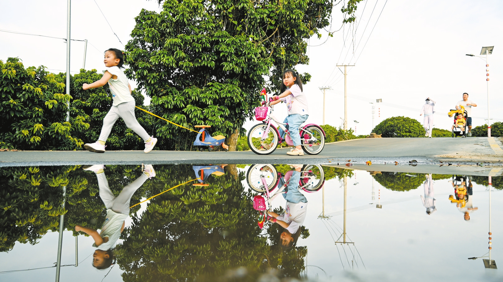 在海口观澜湖电影公社,小朋友们在充满南洋风情的景观区玩耍。 本报记者 孙士杰 摄