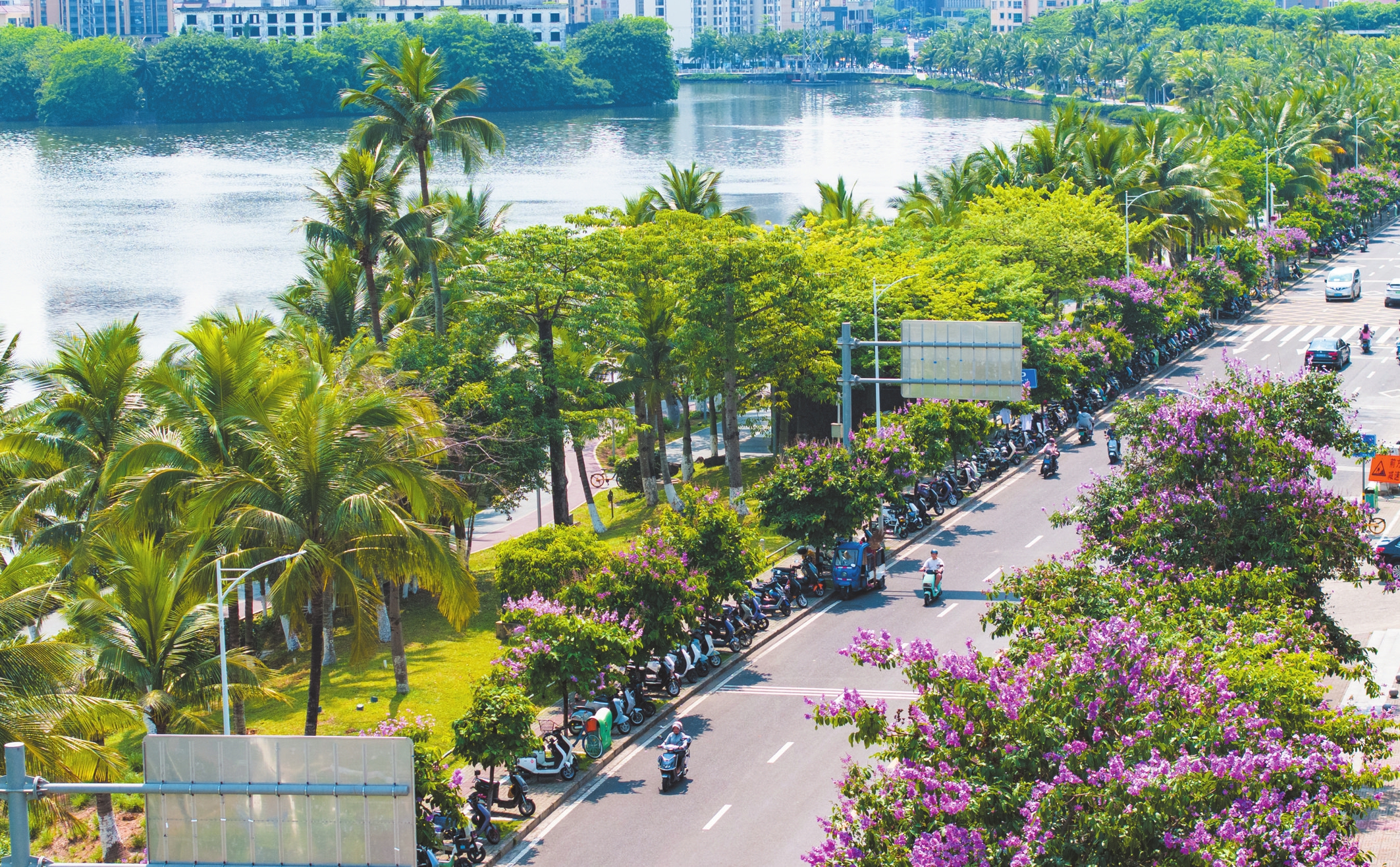 近日,琼山区环湖路上的大花紫薇盛开,紫红色的花朵缀满枝头,在夏日的微风中摇曳生姿,成为街头美丽的景色。