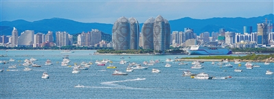 五月十八日,在三亚湾海域,众多游客乘坐游艇出海。 本报记者 王程龙 摄
