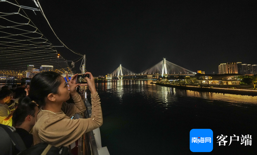在“海南之星”号游船上,市民游客拍照打卡海口湾夜景。记者 李昊 摄