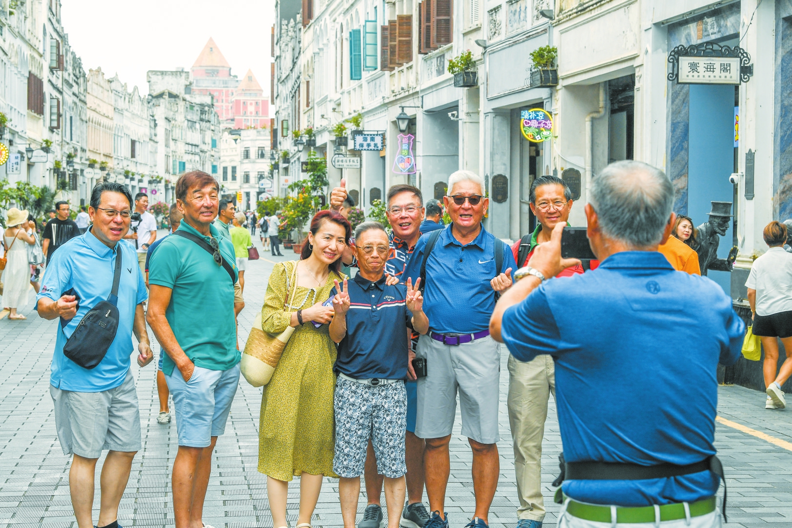 5月30日,新加坡华侨嘉宾在海口骑楼老街打卡拍照。 本报记者 康登淋 摄