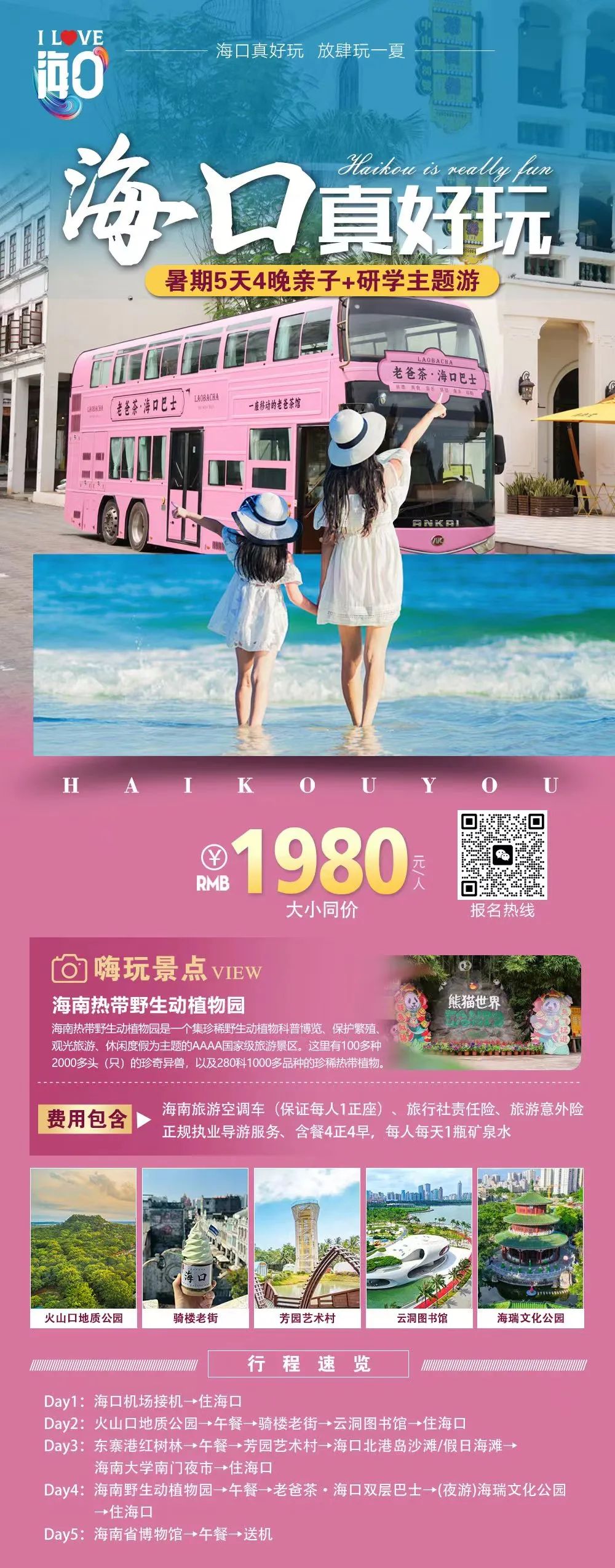 线路特色:嗨游海口,一起“趣”玩。探秘火山文化、感受老街风情、在绿意盎然的自然中撒欢、和动物萌宝来场亲密接触,在博物馆里了解历史文化,在浅滩赶一次海……这趟亲子研学游带你深入体验海岛椰城的独特魅力,带小朋友来玩就对了!