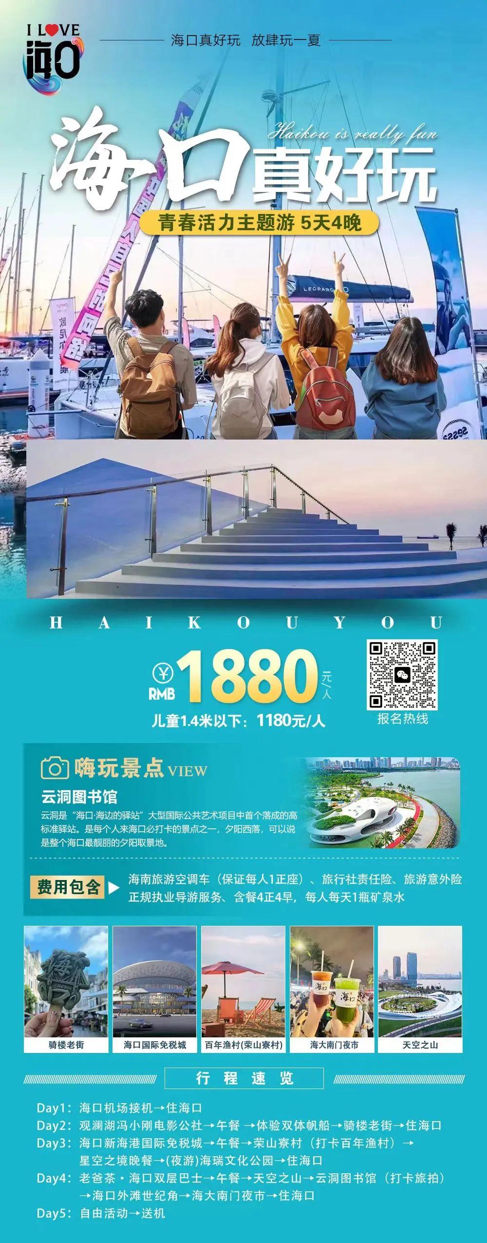 线路特色:青春狂欢,潮玩打卡不停歇!体验海上速度与激情、乘坐老爸茶巴士漫游、赏落日看演出、嗨购免税时尚品、夜游海口湾……解锁年轻人的宝藏玩法。
