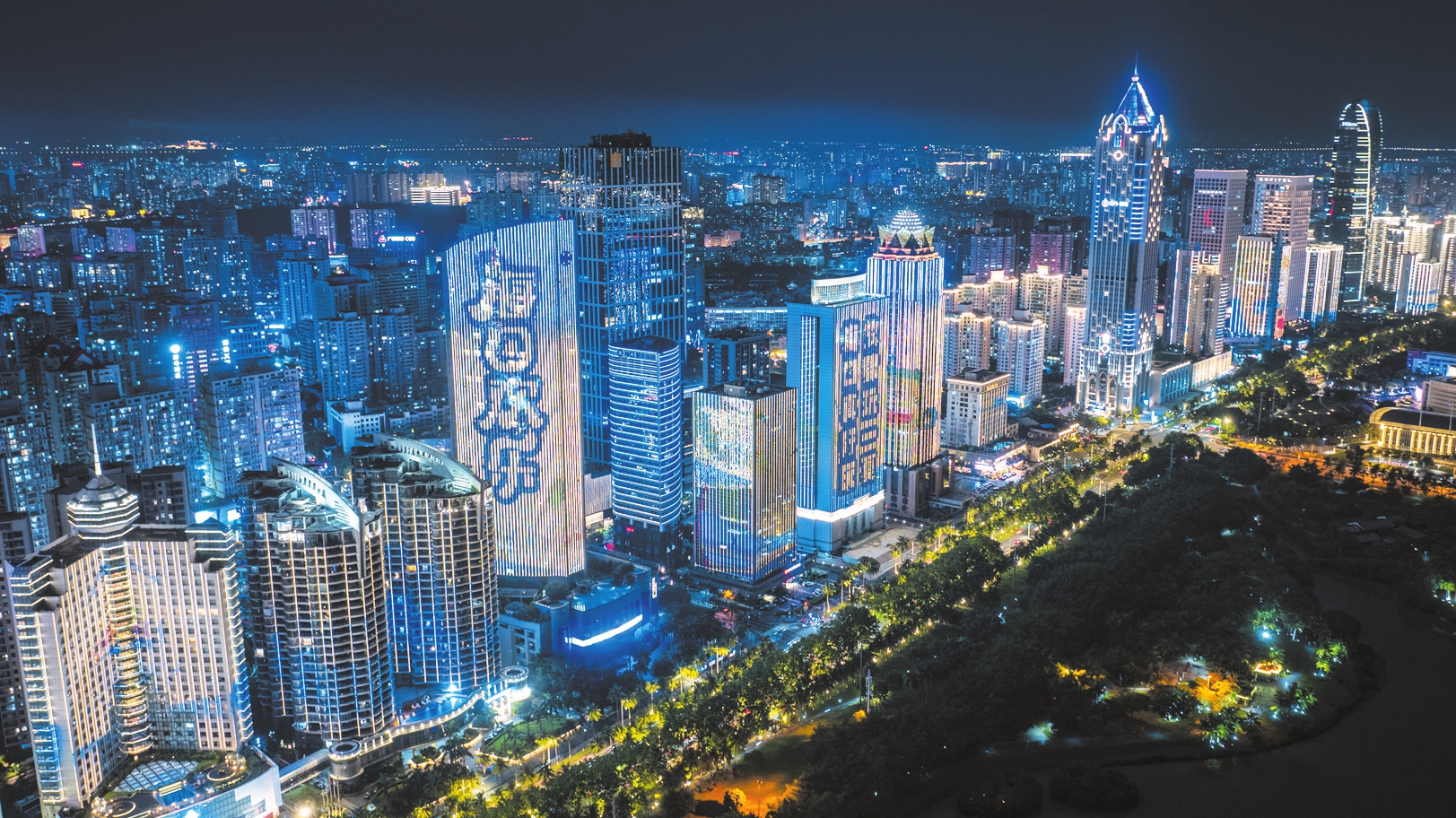 6月17日,以“海口真好玩”为主题的灯光秀在海口滨海大道(万绿园段)楼宇点亮。 本报记者 杨鹤 摄