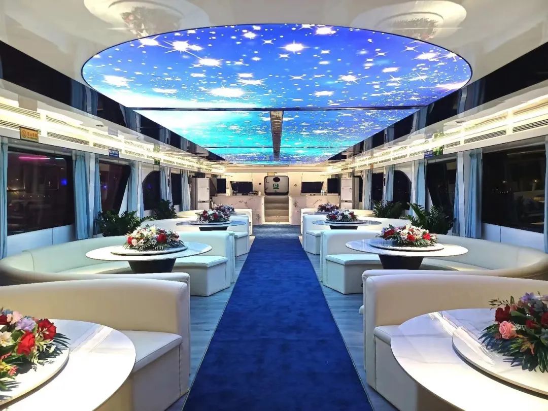 “美兰1号”游船一层为“海上观景音乐餐吧”,配有沿途景点介绍和萨克斯等演出;二层为“尊享定制豪华包厢”,配备了KTV功能;三层为“VIP观景露天餐厅”,同时能容纳30人360度观看海口夜景,是个不可多得的移动观景平台。