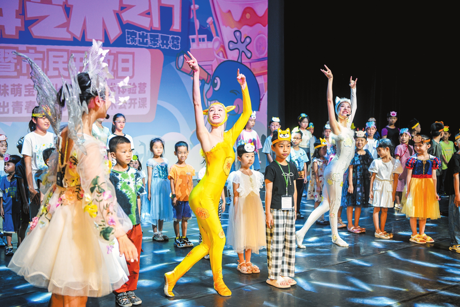 活动现场,孩子们在“趣味萌宝”儿童舞台艺术体验营中,跟随海口市艺术团专业舞者学习基本的舞蹈技巧,并化身童话中的公主和王子,与奇妙的动物世界共舞,完成了一场别开生面的“森林舞会”。同时,“舞出青春”舞台艺术公开课也为成人参与者带来了一场舞蹈盛宴。活动现场五彩斑斓,充满了艺术的气息。