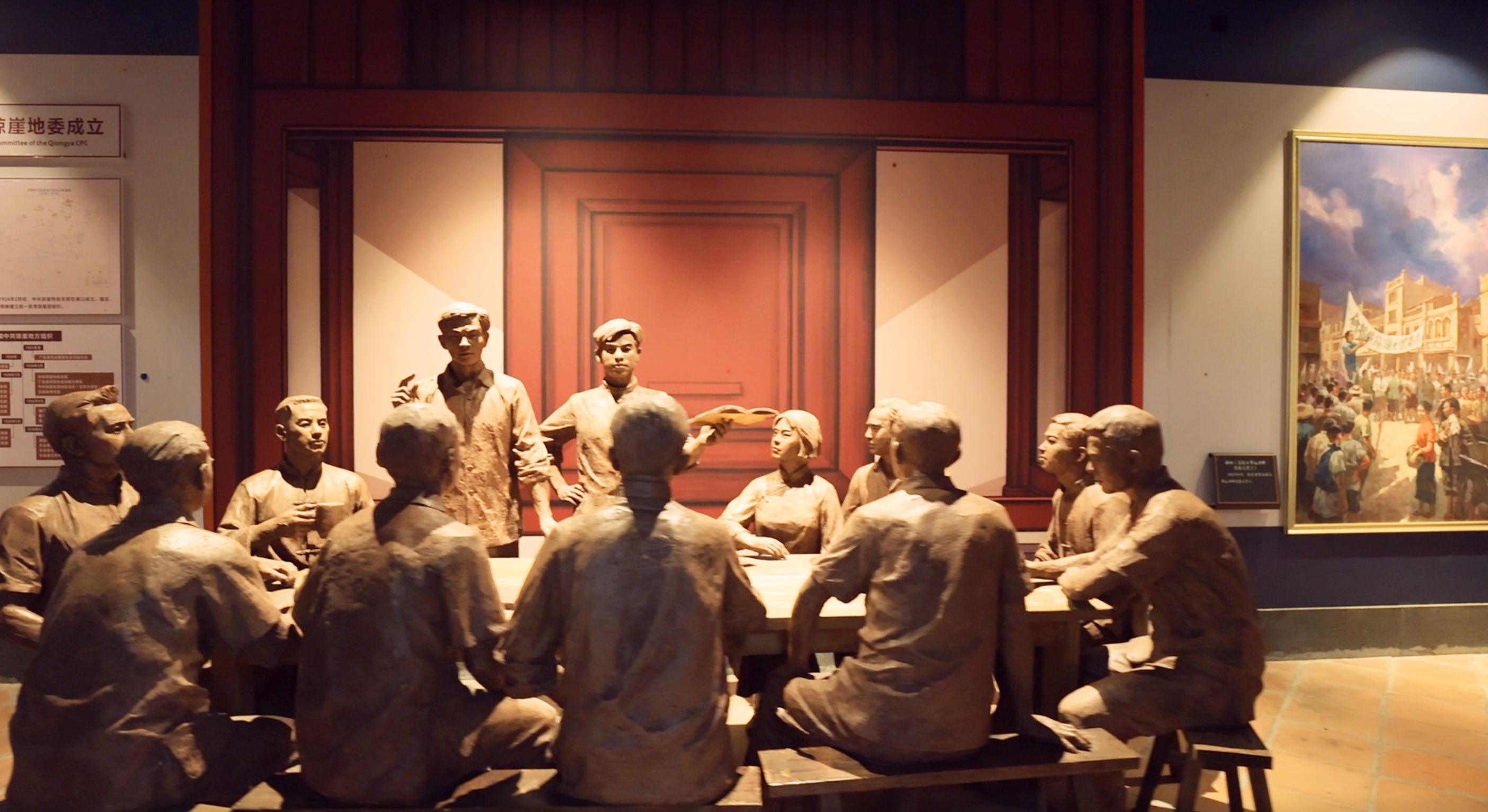 在院中一间悬挂有党旗的展室内,一幅油画重现了中共琼崖第一次代表大会召开时的情景。在参观浏览过程中,通过看短片、观实物、听讲解,带你重温中共琼崖革命历史,缅怀杨善集、王文明等革命先烈,一起领悟琼崖革命“二十三年红旗不倒”精神。
