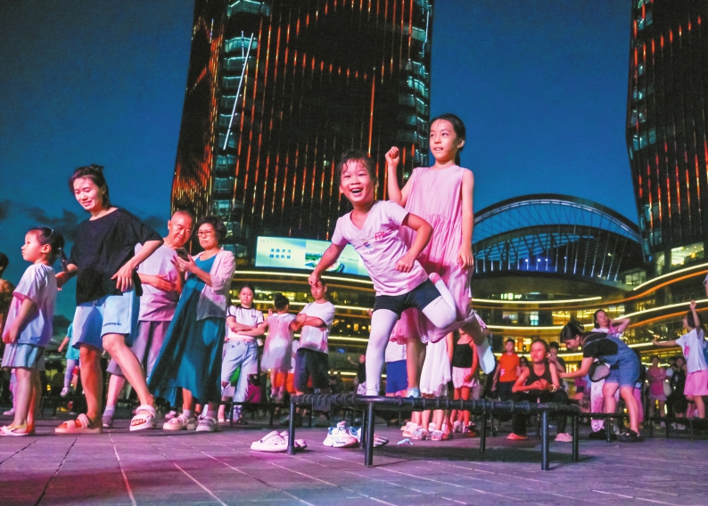 6月22日晚,在华彩·海口湾广场,小朋友和家人正在参与蹦床锻炼互动游戏。