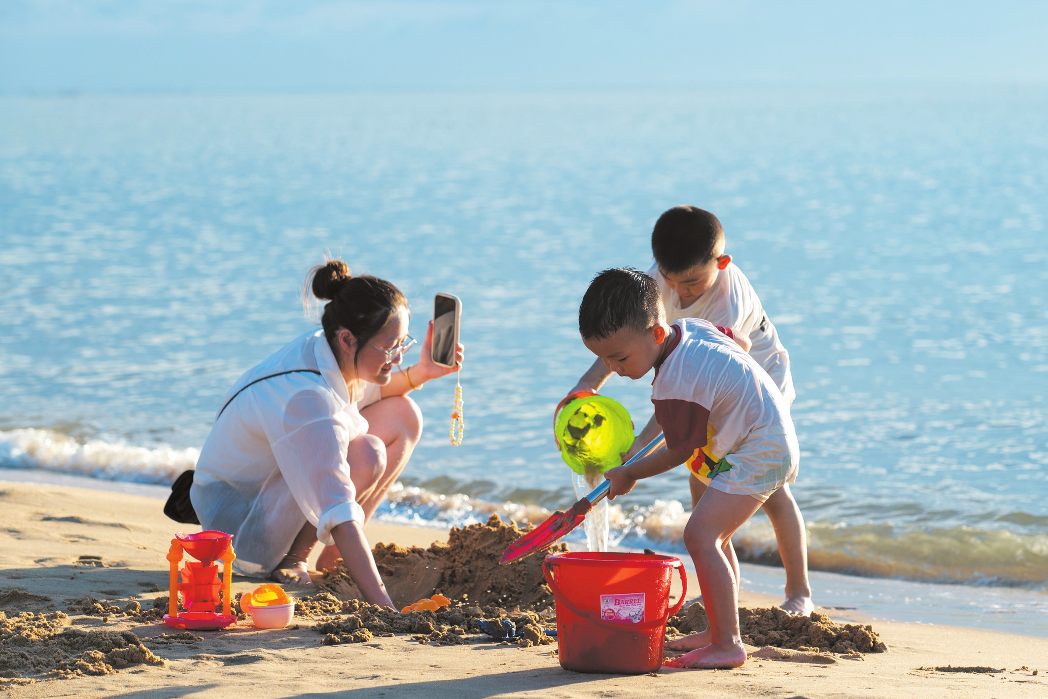 西秀镇荣山寮村,亲子家庭在海边游玩。本报记者 石中华 摄