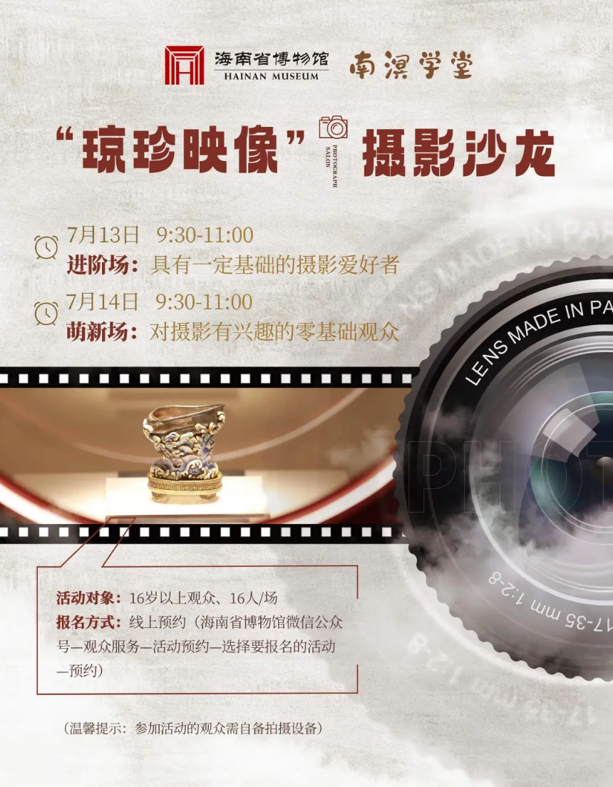 海南省博物馆以该展展陈设计、陈列布局、文物资源,融合摄影艺术,特别策划“琼珍映像”摄影沙龙活动。让摄影爱好者在了解博物馆文物的同时,提升摄影技能。期待您的参与!