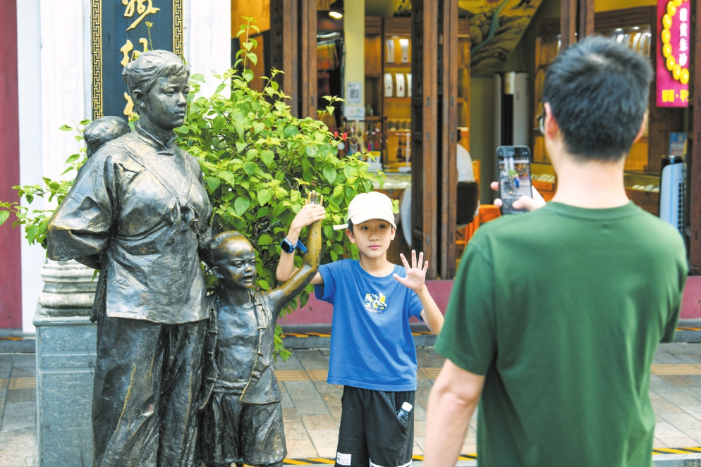 7月12日,游客在骑楼老街与雕塑作品《黄包车》合影打卡。