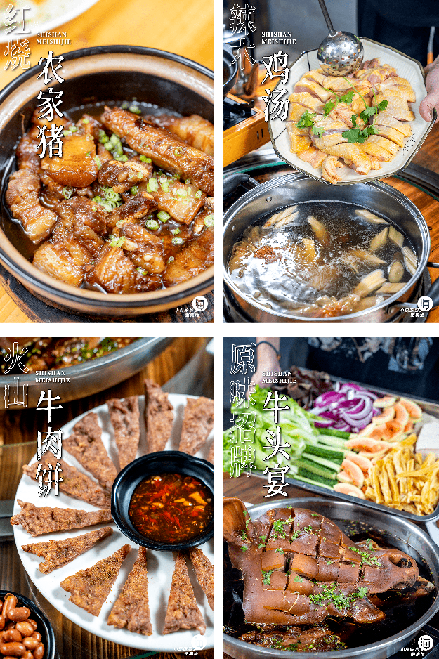 玩累了就在石山生态美食街品尝地道的火山美食,石山粉、辣木鸡汤、干煸羊、石斛鸡汤、石山黑豆腐、红烧农家猪......无论哪种都能让你大快朵颐!