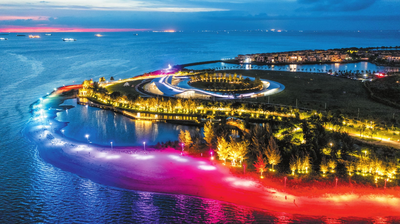 近日,随着夜幕降临,海口天空之山驿站附近的路灯亮起,如同一条“彩带”环绕在海岸沙滩,为到此观光的游客增添了一道独特的风景。