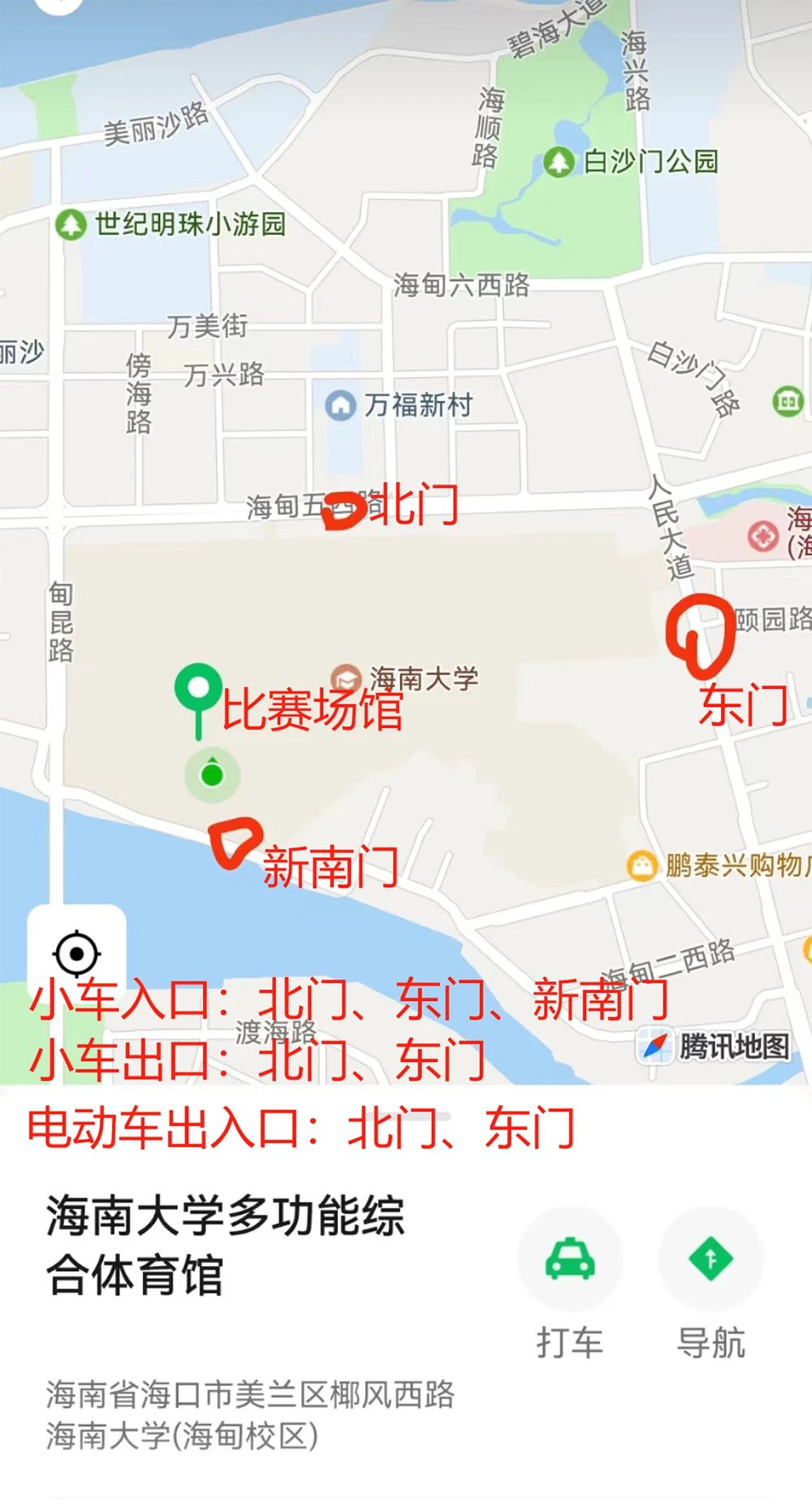 汽车入口:新南门(碧海大道近出海口)、东门(人民大道)、北门(海甸五西路)