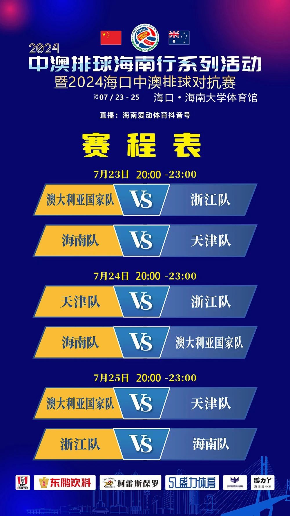 2024海口中澳排球对抗赛由海南省旅游和文化广电体育厅指导,海口市旅游和文化广电体育局支持,海南盛力时代体育文化产业发展有限公司主办,海南省气排球协会、海南省青少年体育联合会、海南省定制旅游协会、海南大学体育学院、海南大学海口校友会协办。爱动体育为直播机构,将全程直播本次比赛。