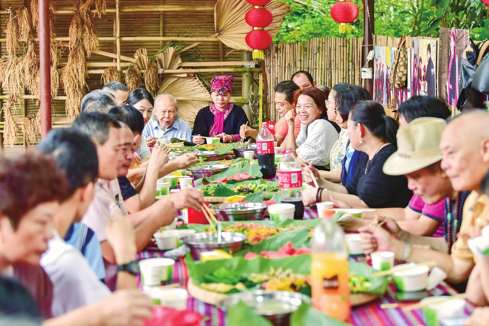 7月31日,灵山镇898艺术村的黎族苗族特色“长桌宴”吸引市民游客前来品尝。 本报记者 苏弼坤 摄