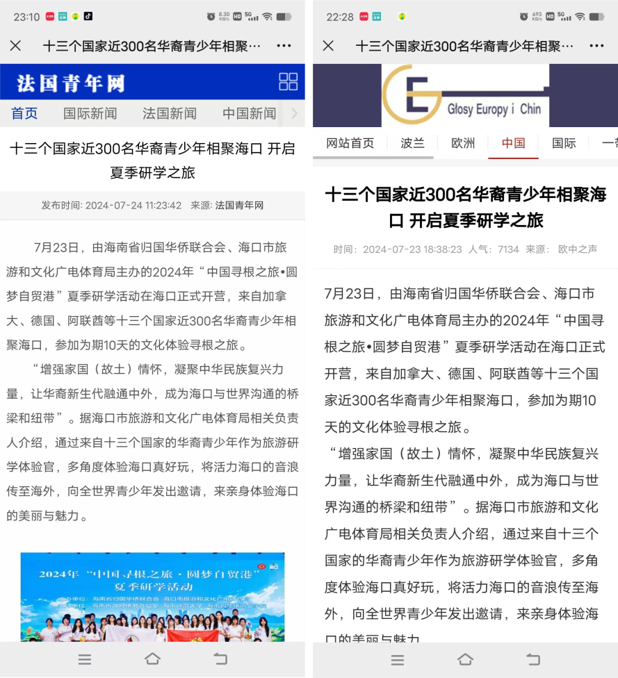 截至8月7日,香港媒体大公网海口板块发布稿件9篇,此次活动累计阅读量达29.3万余次,其中热点推荐达4.7万余次,4 篇原创视频浏览量共计12.7万余次。并通过欧中之声、英国富中传媒、欧洲侨报、法国青年网等4家海外华文媒体进行稿件发布,覆盖欧洲侨胞以及巨量的海外用户。而参与此次活动的华裔青少年们也通过自身及海外亲友影响力,将“海口真好玩”这一具象化旅文体验更聚焦、垂直传至海外华人圈,成为海外华人热议的话题。