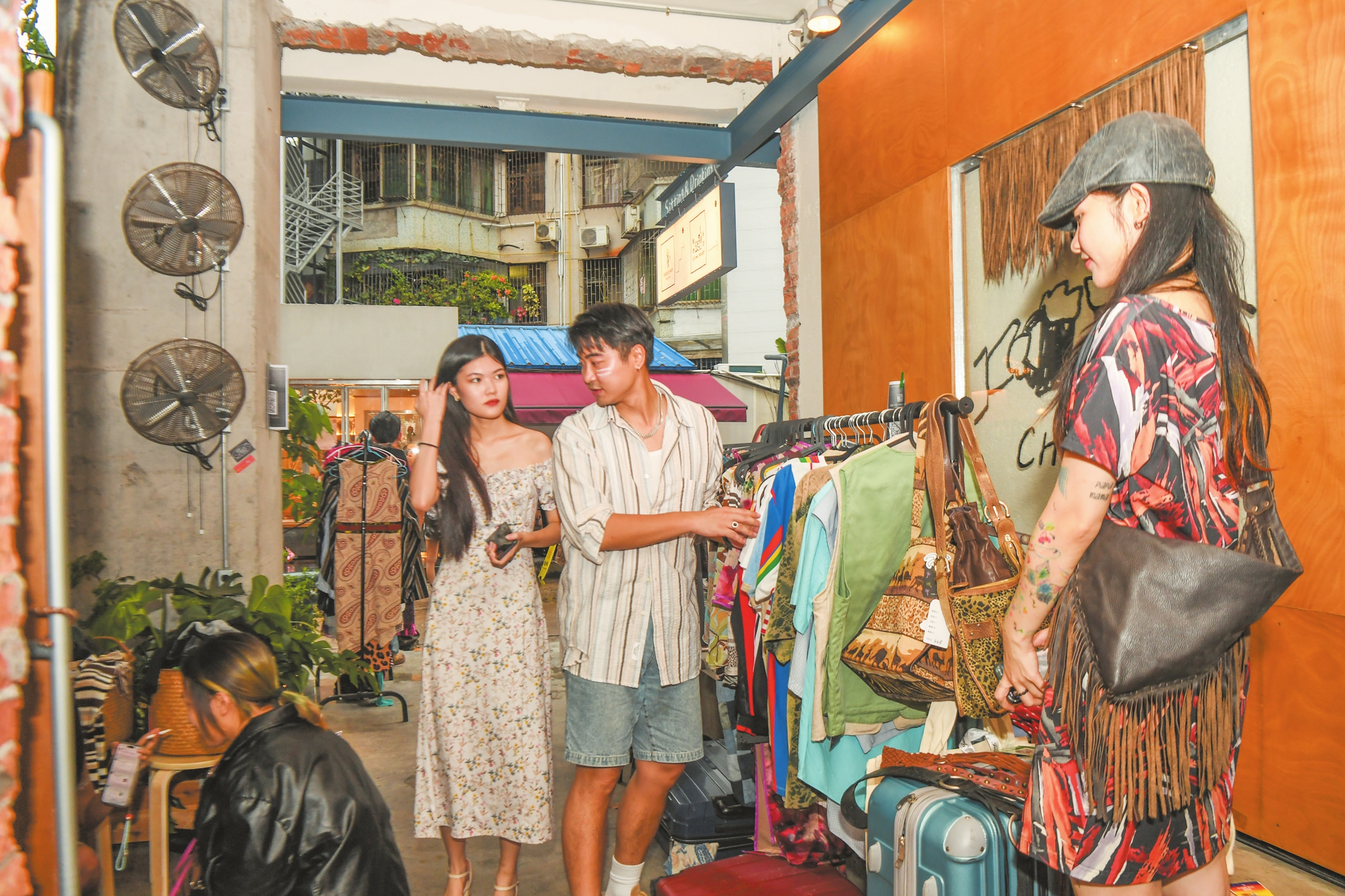 8月17日,在海口龙兴路“姐妹们一起穿美衣”二手市集上,市民游客在挑选商品。本报记者 康登淋 摄