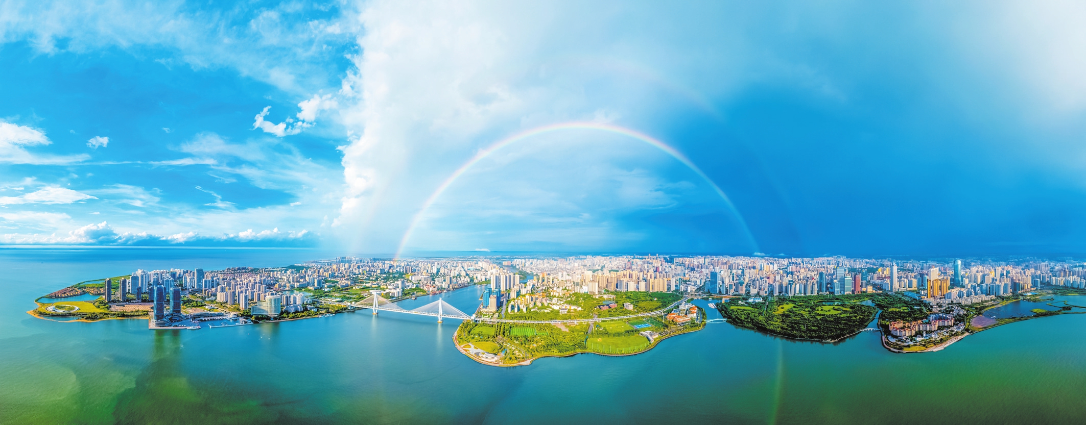 大雨过后,天空的双彩虹为生机勃勃的海口湾增添了一道靓丽的景致。放眼望去世纪大桥、天空之山、云洞图书馆、世纪公园、滨海公园、万绿园等尽收眼底。 本报记者 石中华 摄
