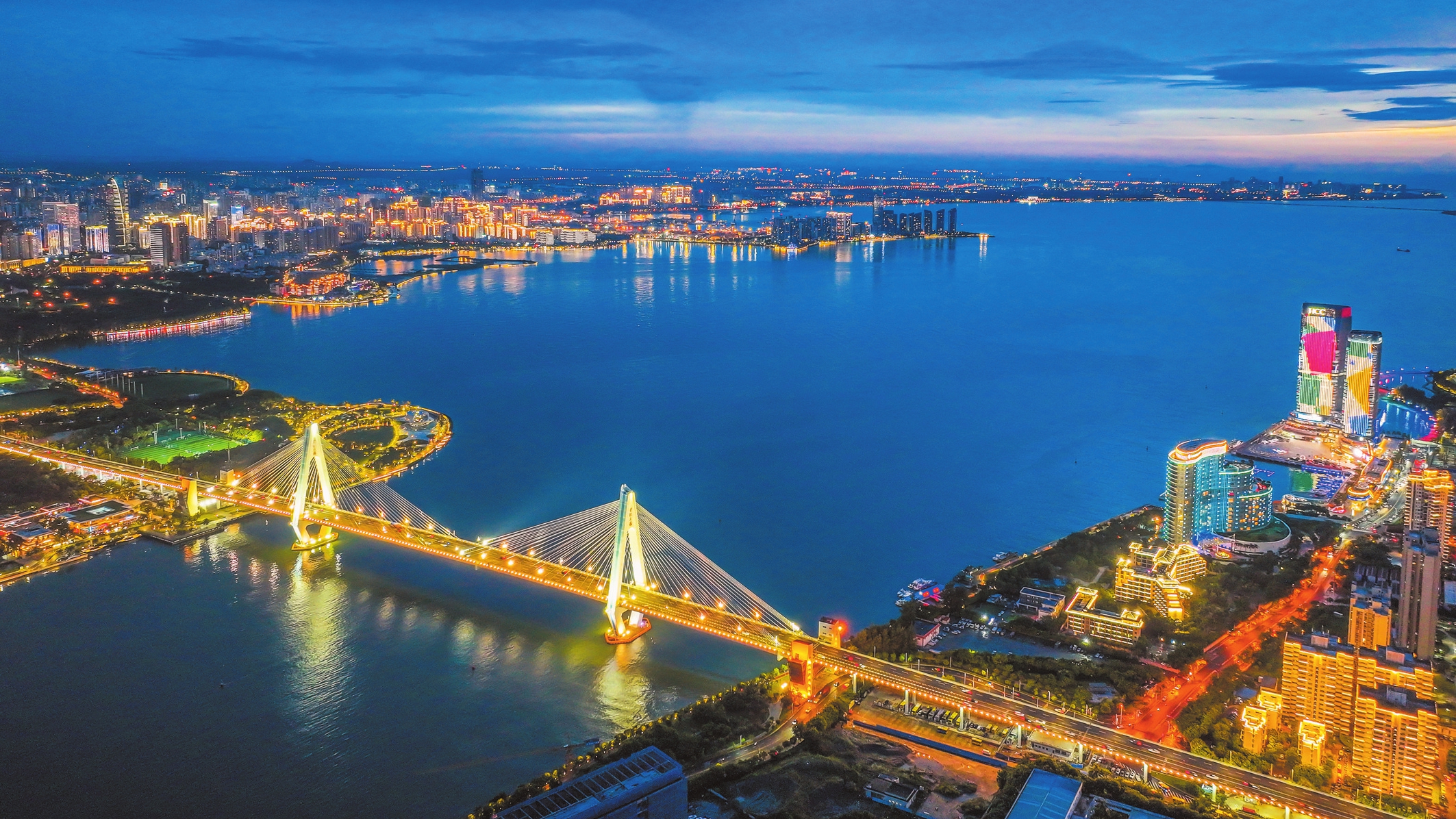 晚霞将海口湾染成紫金色,波光粼粼中散发着梦幻般的光彩,映衬着灯光璀璨的海口湾。 本报记者 康登淋 摄