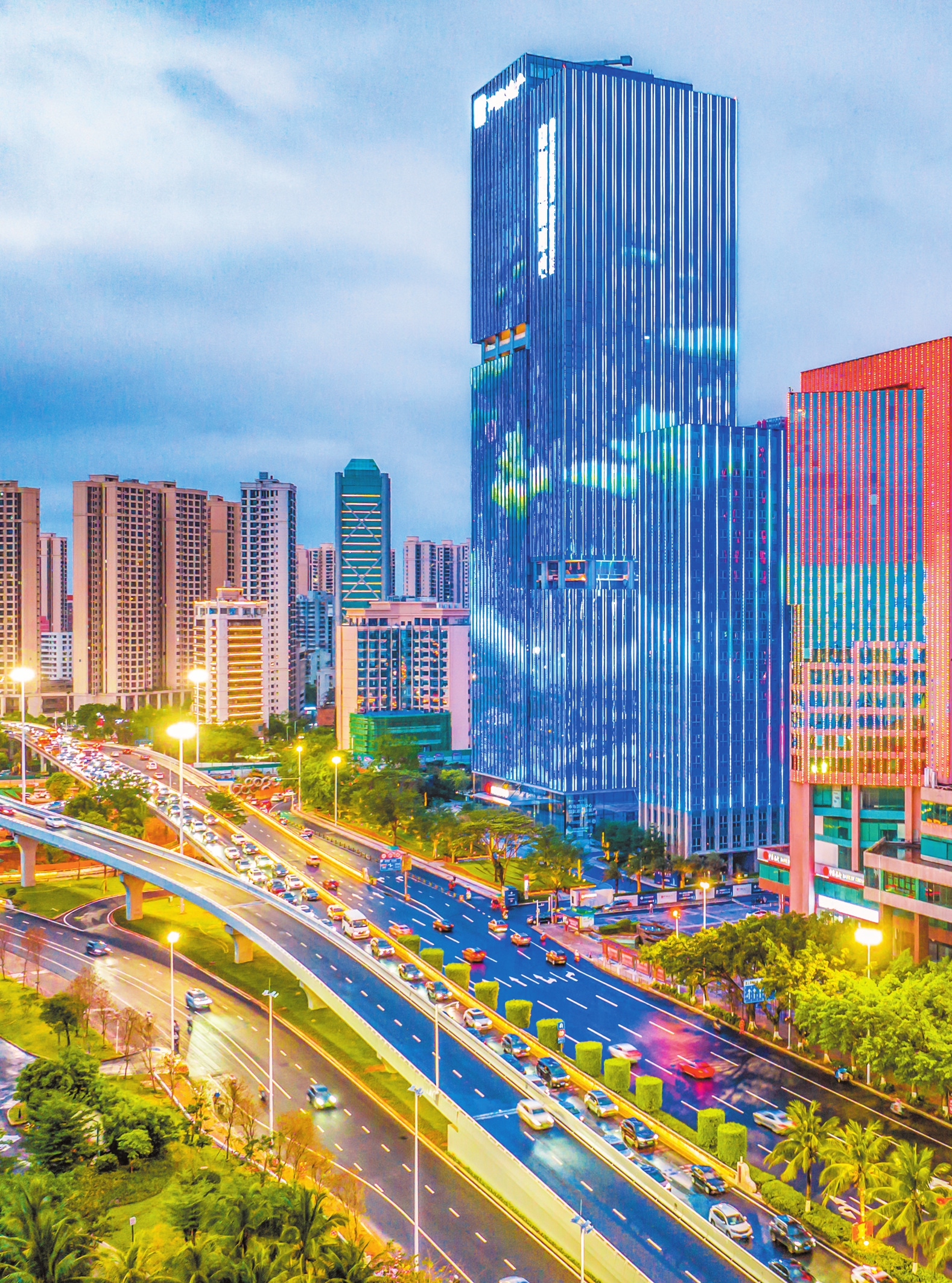 夜幕降临,位于滨海大道的海口中海国际中心与车水马龙的滨海立交桥共同构成一幅美丽的城市画卷。 本报记者 康登淋 摄