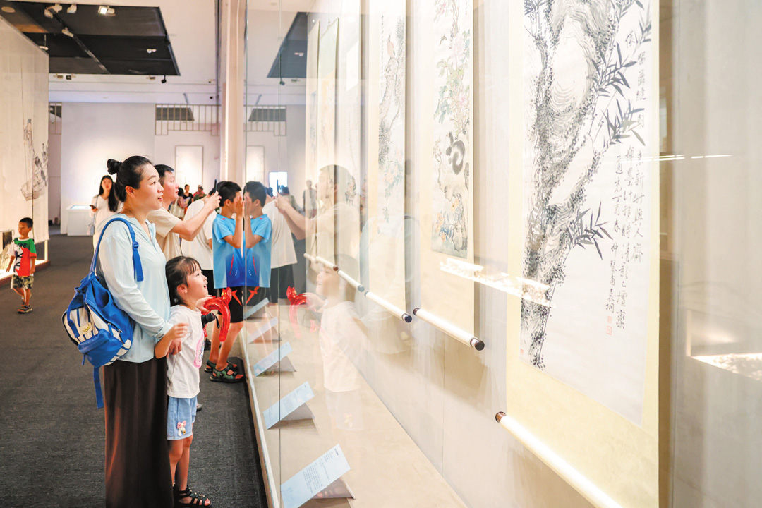 “尽携书画到天涯”书画特展上,市民游客正在认真欣赏精美的书画作品。本报记者 苏弼坤 摄