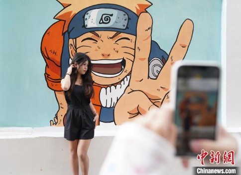 10月12日,海南海口,2名年轻人专程来到动漫游戏墙绘前拍照游玩。陈英清 摄