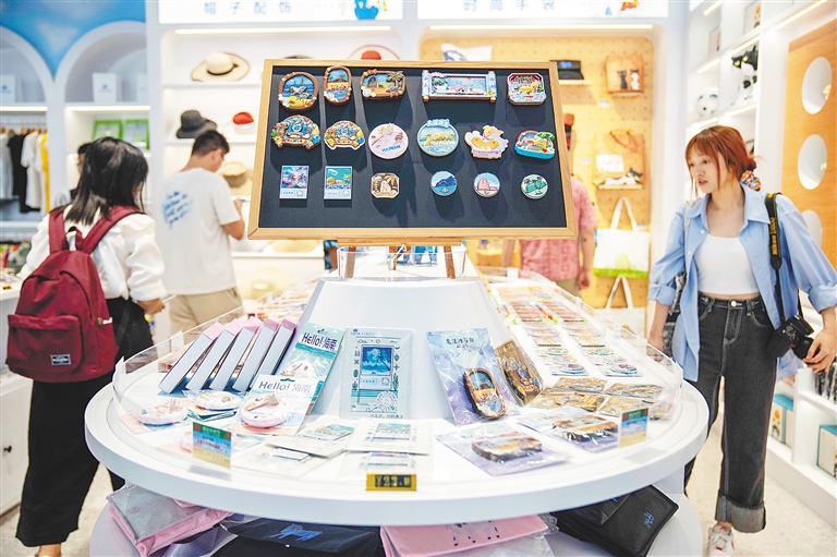 游客在三亚大东海风景区游客中心选购文创产品。王将就 摄
