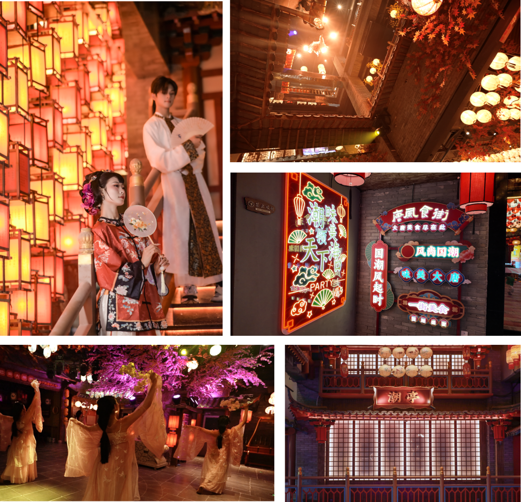 TIPS:一楼西市步梯灯笼区、穿过西市大街的中一门霓虹灯区、走到中二门来到一楼东市枫叶区、一楼东市步云梯、二楼百味坊桃花树下、二楼潮亭舞台区域、三楼潮亭皆是出片打卡点位。