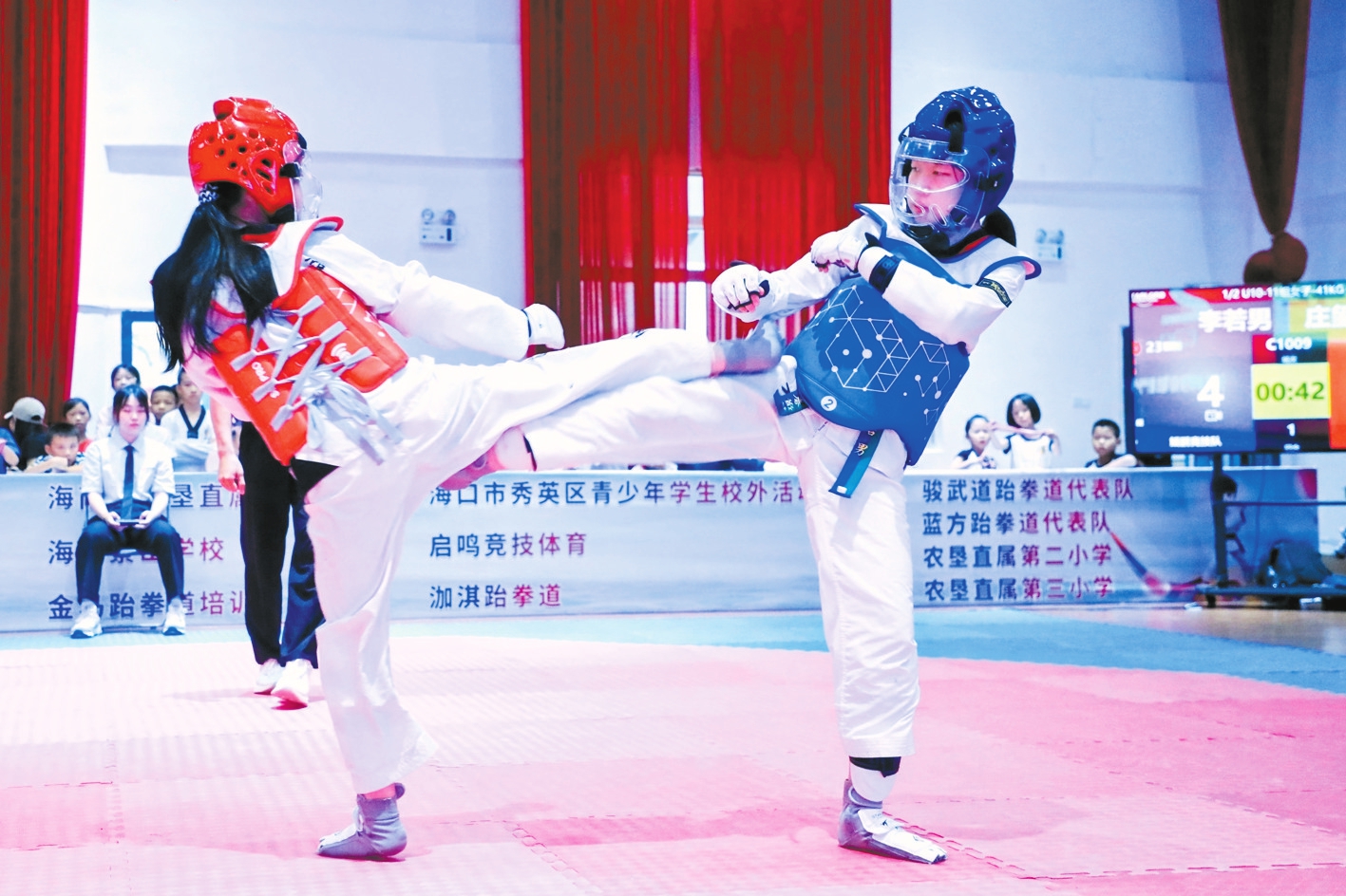 在海口市第五届“椰青杯”青少年跆拳道比赛中,青少年跆拳道选手身着护具和白色道服展开激烈比拼。