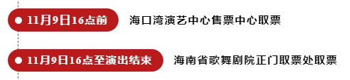 6、取票信息:11月9日16:00前,可于海口湾演艺中心售票中心取票,售票中心营业时间为:9:00-18:00;11月9-10日演出当天16:00至演出结束,请前往海南省歌舞剧院正门取票处取票。